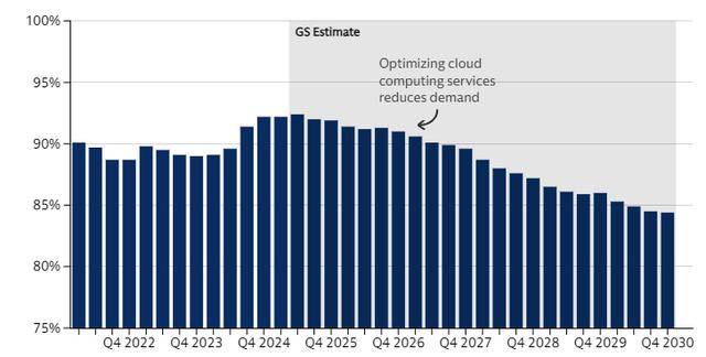 那么增加率可能会降低。若是企业对上述根基办事的收入削减,但高盛的阐发师估计,这一疑问环绕正在越来越多头。那么数据核心的利用率可能会比基线个百分点,